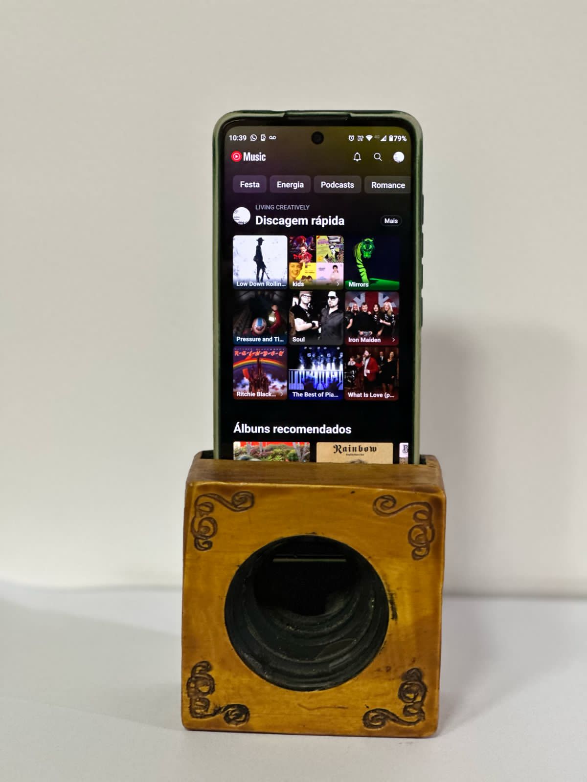 Amplificador para celular de madeira personalizado,coloque seu nome, seu QRCode do whatsapp ou logo ou simbolo do seu signo ou da sua banda preferida etc. Pode aumentas em até 20dB. Medidas: 9,5 x 5,5 x 9,8 cm